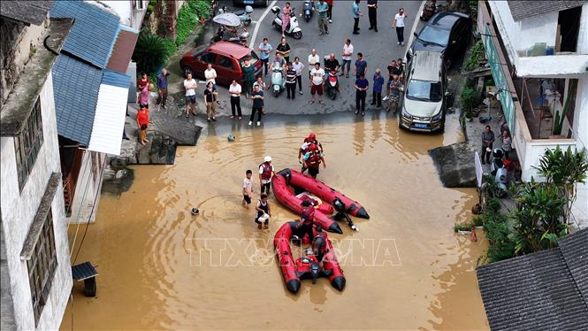 Lực lượng cứu hộ hỗ trợ người dân di chuyển qua vùng ngập lụt tại Khu tự trị dân tộc Choang Quảng Tây, Trung Quốc.