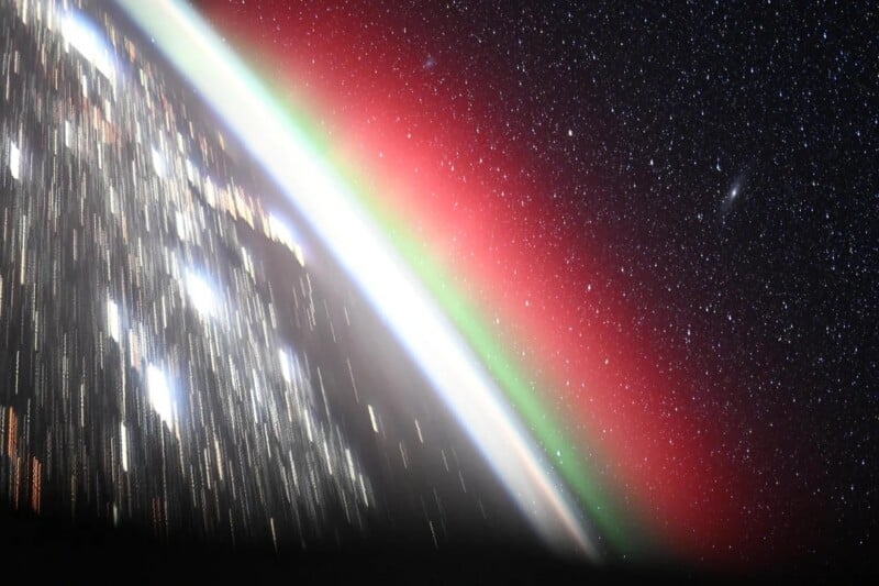 Với thời gian phơi sáng 10 giây, ảnh còn ghi lại ánh sáng thành phố từ Trái Đất, cùng cực quang đỏ và xanh được chiếu sáng bởi Mặt trời mọc. Pettit sử dụng thiết bị tự chế để giữ khung hình ổn định dù trạm ISS đang bay với tốc độ cao.