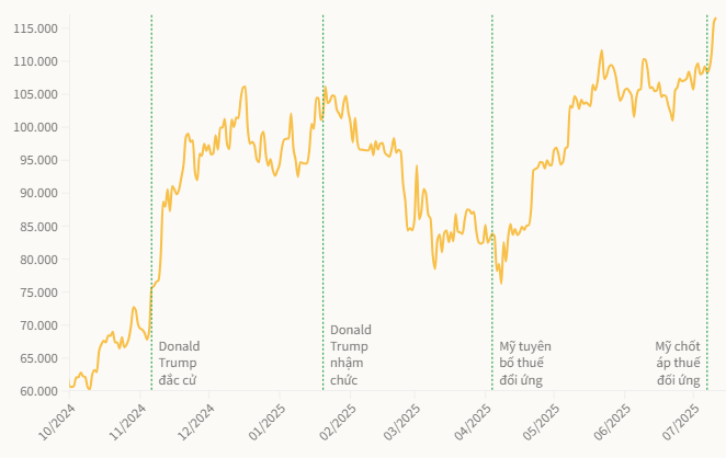 Sang ngày 11/7, biểu đồ gần như dựng đứng. Khoảng 0h30, thị giá đạt 113.500 USD, tăng gần 4% so với 24 giờ trước đó, sau đó tiếp tục đi lên và vượt 115.000 USD (lúc 5h30). Tiền số lập kỷ lục mới, cao hơn mức đỉnh cũ khoảng 1.900 USD.