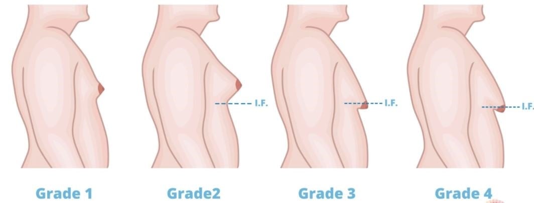 Dựa trên đặc điểm hình thái tuyến vú trên siêu âm, phân loại của Rohrich: Độ 1: phì đại tối thiểu <250g, không có sa trễ; Độ 2: phì đại vừa 250-500g, không có sa trễ; Độ 3: phì đại nặng >500g, sa trễ độ 1; Độ 4: phì đại nặng kèm sa trễ độ 2 hoặc 3. Ảnh minh họa BSCC