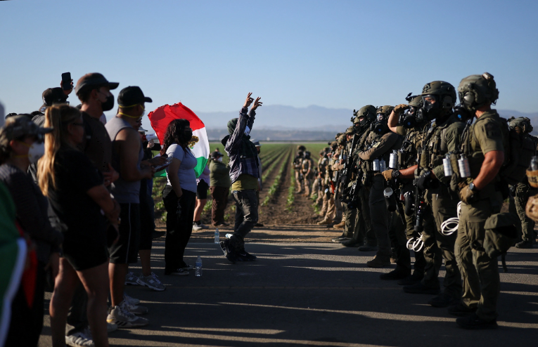 Đối đầu giữa người biểu tình và phía đặc vụ liên bang đang chặn đường dẫn đến nông trại ở Camarillo (bang California, Mỹ) ngày 10.7