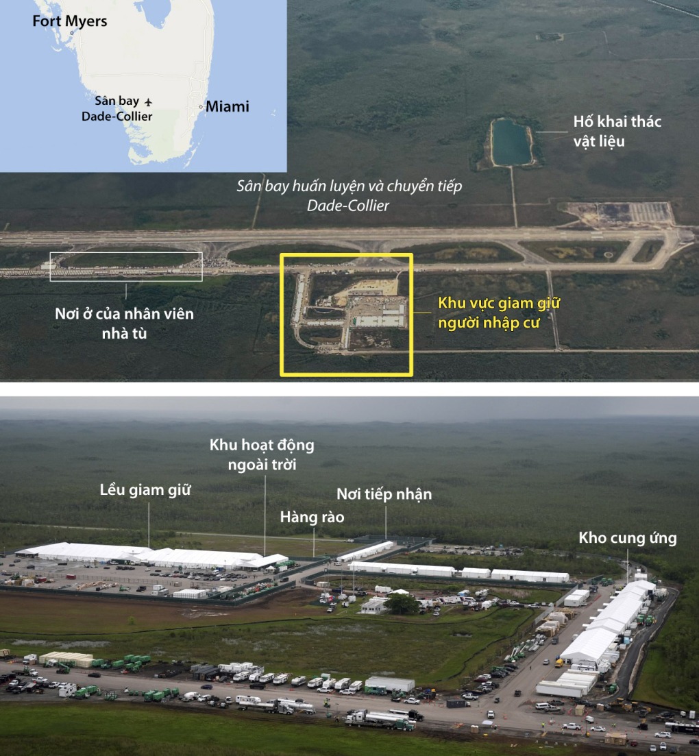 Giới chức Florida ngày 23/6 bắt đầu xây dựng một cơ sở giam giữ người nhập cư tại Sân bay huấn luyện và chuyển tiếp Dade-Collier nằm sâu trong vùng đầm lầy ngập nước Everglades. Đây là nơi sinh sống của hệ động vật đa dạng, trong đó đáng chú ý có cá sấu nước mặn và cá sấu mõm ngắn.