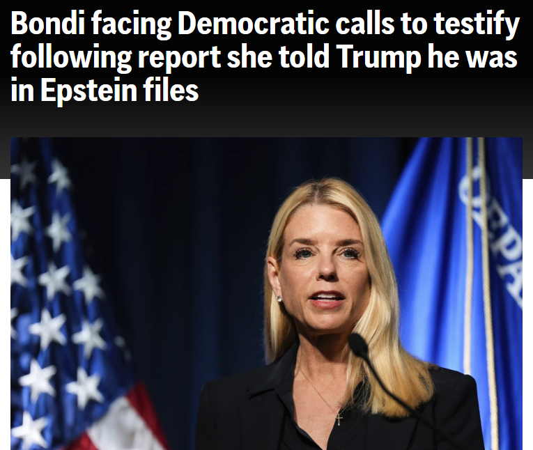 Bộ Trưởng Tư Pháp - Pam Bondi đang phải đối mặt với lời kêu gọi ra làm chứng của Đảng Dân chủ sau khi có thông tin bà nói với ông Trump rằng ông có tên trong hồ sơ của Epstein