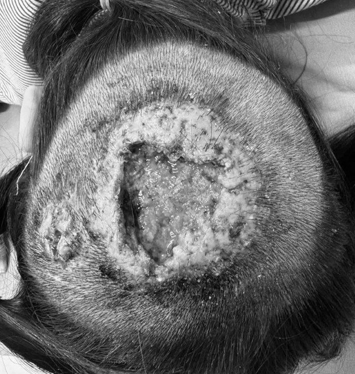 Phạm Duy Linh, Khoa Phẫu thuật - Tạo hình thẩm mỹ, Bệnh viện Đa khoa Đức Giang cho biết đã điều trị cho một ca bệnh rất đặc biệt "nấm tổ ong da đầu ở trẻ em Kerion" gây áp xe hoại tử sâu rộng vùng đỉnh đầu.