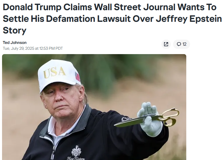 Donald Trump tuyên bố rằng tờ Wall Street Journal muốn dàn xếp vụ kiện trị giá 10 tỷ đô la mà ông đã đệ đơn chống lại tờ báo này và Rupert Murdoch hồi đầu tháng về một bài báo về mối quan hệ của ông với Jeffrey Epstein.