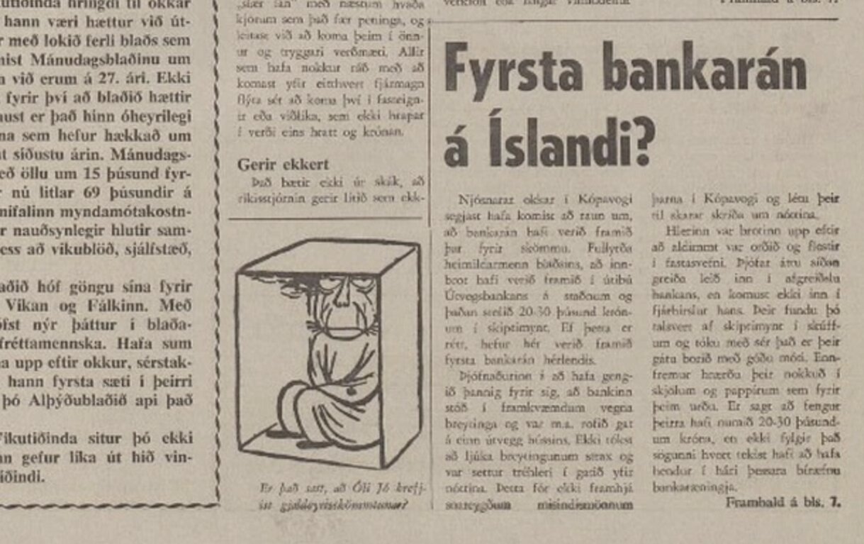 Theo bài báo thời điểm đó, đây có thể là “vụ cướp ngân hàng đầu tiên” ở Iceland. Tuy nhiên, ông Gunnar Runar Sveinbjornsson – phát ngôn viên cảnh sát Reykjavik – giải thích rằng nhóm thiếu niên khoảng 14 tuổi này không sử dụng bạo lực hay đe dọa, nên đúng hơn phải gọi là “vụ trộm ngân hàng đầu tiên”.