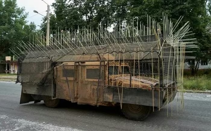 Một chiếc xe quân sự của Ukraine ở Kostyantynivka, được trang bị áo giáp lồng để chống lại UAV FPV từ Nga. (Nguồn: X)