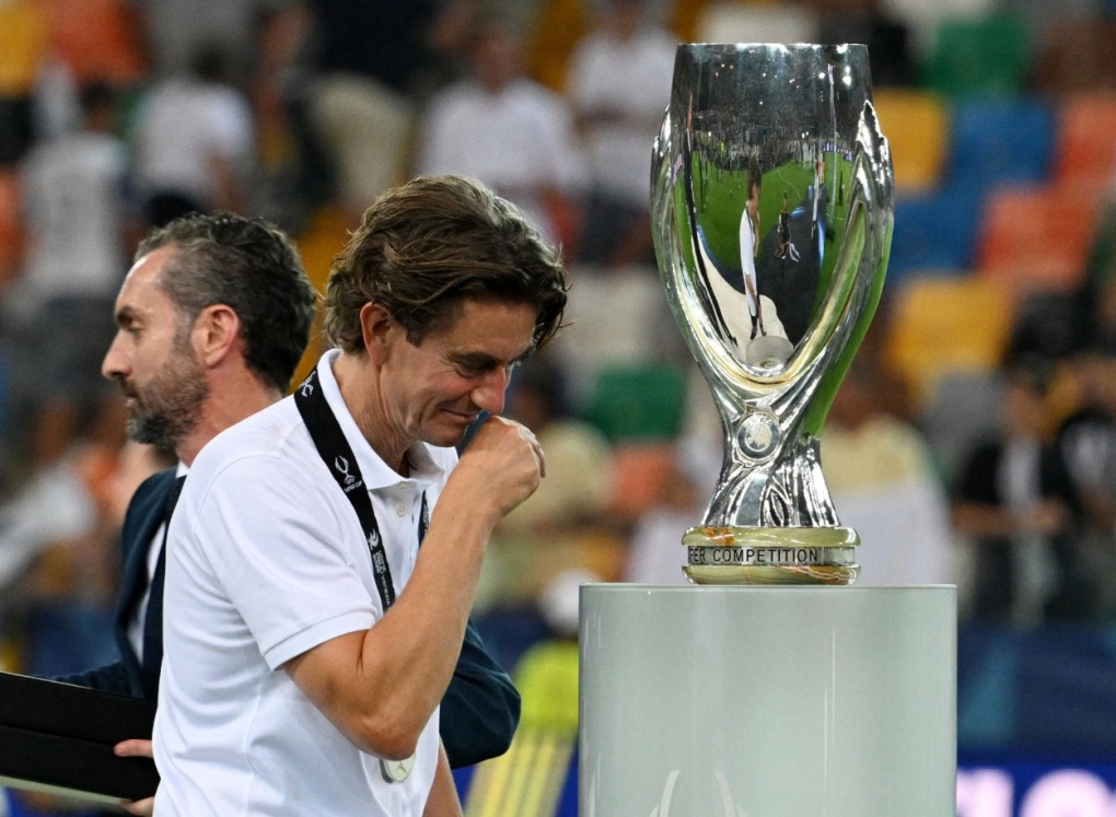 HLV Thomas Frank bước qua danh hiệu Siêu Cup châu Âu, sau khi Tottenham thua ngược PSG trên sân Bluenergy, Italy ngày 13/8. Ảnh: UEFA