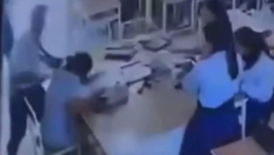 Hình ảnh do camera trong lớp ghi lại cho thấy nam sinh đã giận dữ tấn công cô giáo. Ảnh: Thai PBS.