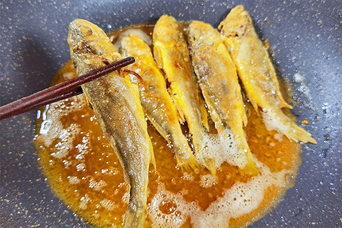 Chiên sơ: Đun nóng dầu trong chảo lớn ở lửa vừa. Bạn có thể kiểm tra độ nóng bằng cách cho đũa vào chảo và thấy các lớp bọt nhỏ nổi lên. Giảm lửa xuống mức trung bình thấp và lần lượt cho từng con cá vào chảo; lưu ý không xếp chồng lên nhau.