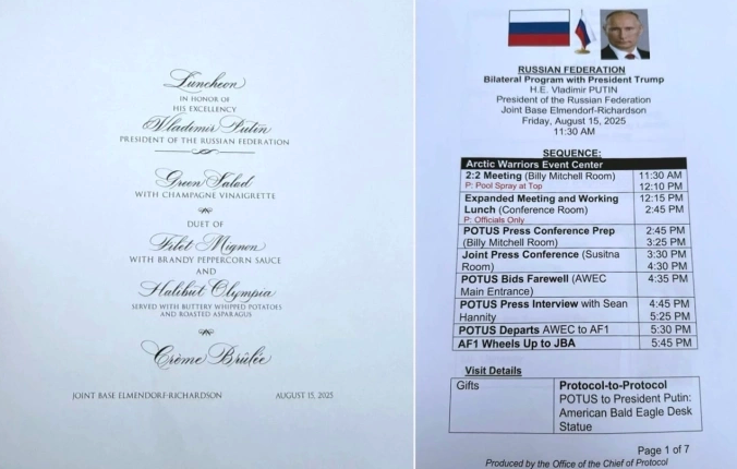 Trang đầu tiên của tập tài liệu ghi rõ trình tự các cuộc họp ngày 15/8, nêu tên các phòng họp tại căn cứ liên hợp Elmendorf-Richardso. Tài liệu cũng cho thấy ông Trump dự định tặng ông Putin tượng đại bàng đầu trắng, loài chim biểu tượng của nước Mỹ.