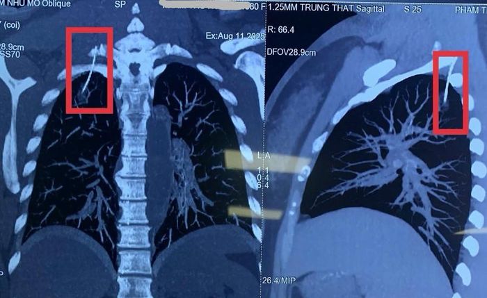 Lo lắng, gia đình đưa bà H. đến bệnh viện để kiểm tra. Hình ảnh chụp cắt lớp vi tính dựng hình phát hiện một dị vật kim loại đã xuyên qua vùng vai, chọc vào khoang màng phổi phải, vị trí ở đỉnh phổi. Các bác sĩ xác định đây chính là kim châm cứu bị gãy hoặc đi lạc trong quá trình thực hiện.