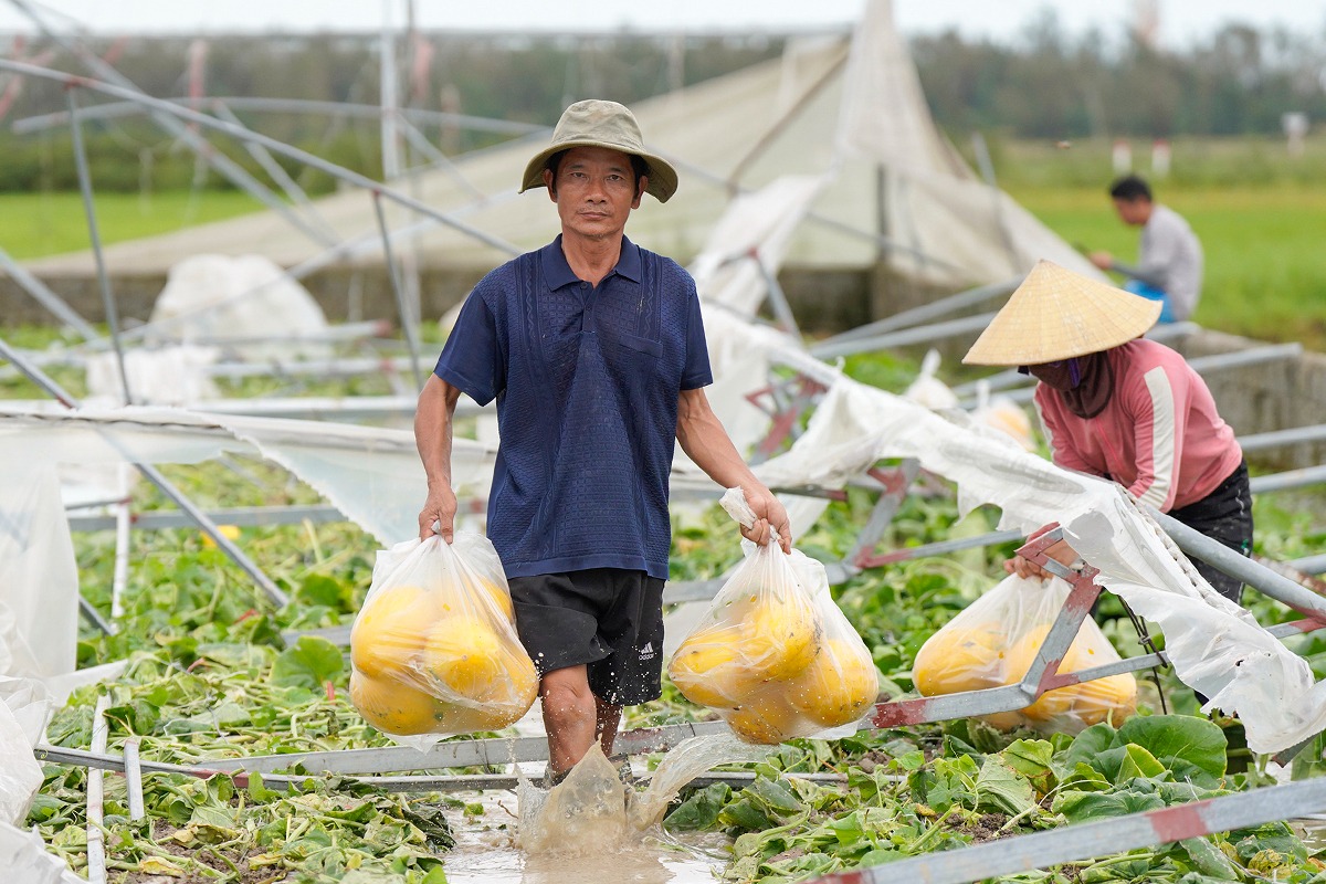 "Đến khoảng 16h, gió bão đổi chiều, thổi ngược từ bờ ra hướng biển. Nhà màng xiêu vẹo rồi đổ sập", ông Quang thuật lại. 5 người trong gia đình từ nhà nhìn ra vườn dưa, thấy khung cảnh tan hoang thì gần như chết lặng.