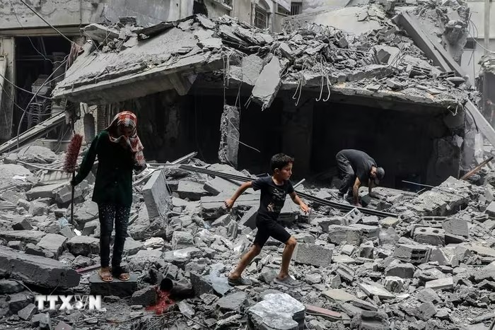 Tòa nhà bị phá hủy sau cuộc không kích của Israel tại Gaza. (Ảnh: THX/TTXVN)