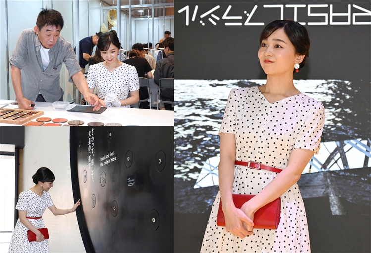 Cô dành thời gian trải nghiệm quy trình làm đồ sơn mài Tsugaru-nuri , một di sản văn hóa phi vật thể quan trọng của Nhật Bản. Hình ảnh cô tỉ mỉ dùng giấy nhám ướt để mài một chiếc đế lót ly, cẩn thận hỏi người thợ thủ công về cách làm, cho thấy sự nghiêm túc và tôn trọng của cô đối với nghề thủ công truyền thống.