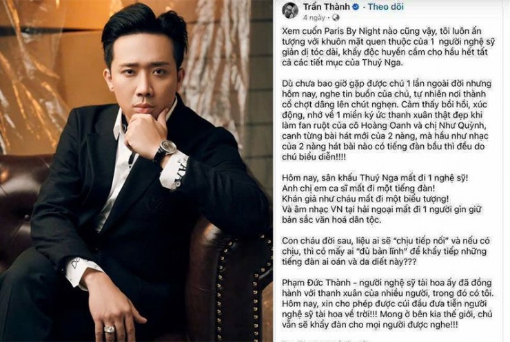 Nội dung status lại càng gây phản cảm. Thay vì một lời chia buồn ngắn gọn, Trấn Thành dành cả đoạn dài hồi tưởng về Paris By Night, về sân khấu Thúy Nga, ngợi ca các nghệ sĩ hải ngoại như “một biểu tượng của âm nhạc”, rồi bi quan với câu hỏi: “Con cháu đời sau, liệu ai sẽ "chịu tiếp nối", và nếu có chịu, thì có mấy ai "đủ bản lĩnh" để khảy tiếp những tiếng đàn ai oán và da diết này?”. Những câu chữ ấy, trong ngày đáng lẽ ngập tràn niềm vui dân tộc, lại gieo vào lòng người cảm giác tang thương, bi lụy và đầy ẩn ý, mà người cả nghĩ một chút có thể nhận ra chủ ý của người viết bài.