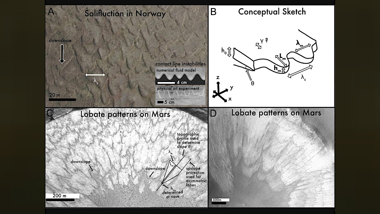 Họ phát hiện ra một loạt địa hình dạng sóng mang hình dạng và mô hình hình học tương tự như các thùy núi lửa, thường thấy ở các vùng núi lạnh giá trên Trái Đất như Bắc Cực và dãy núi Rocky.