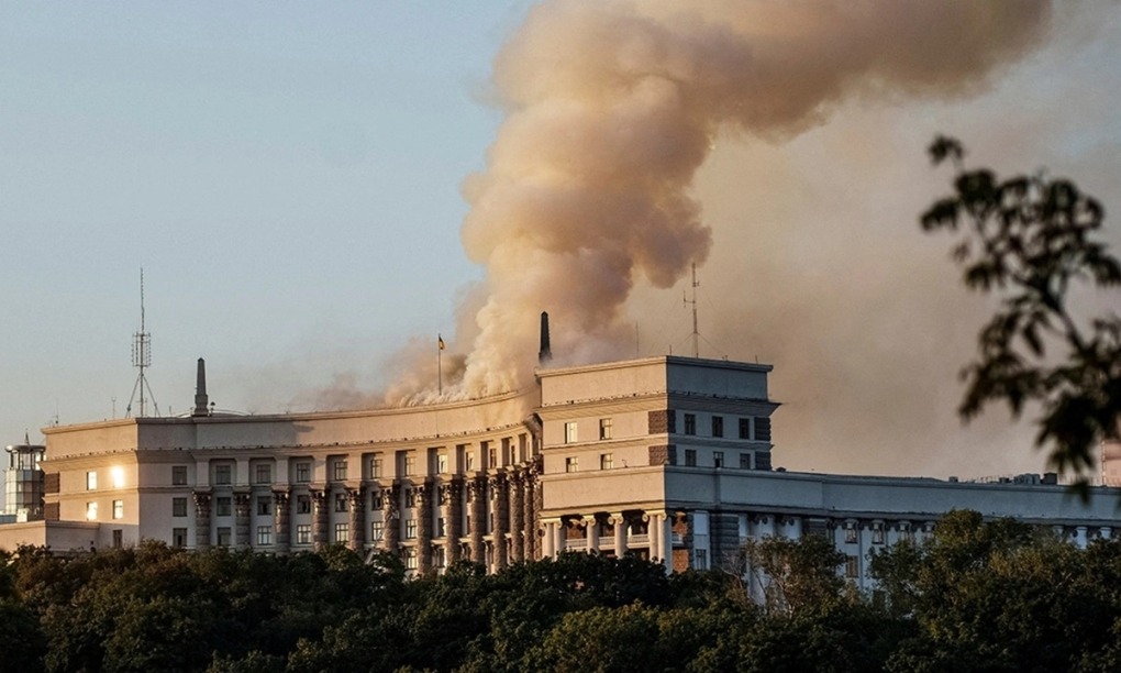 Khói bốc lên từ tòa nhà Nội các Bộ trưởng Ukraine sau cuộc tập kích của Nga vào Kiev hôm 7/9. Ảnh: Reuters