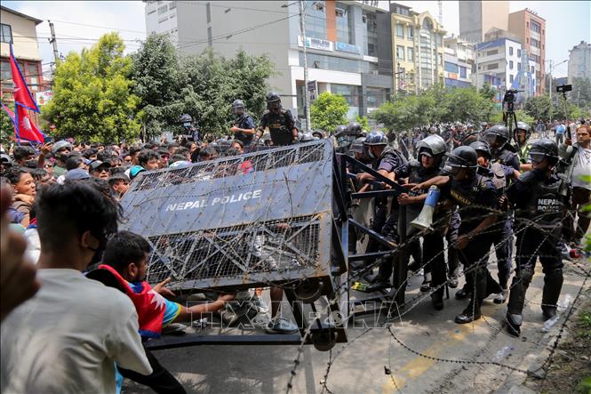 Cảnh sát ngăn dòng người biểu tình bạo loạn phản đối Chính phủ tại thủ đô Kathmandu, Nepal ngày 8/9/2025.