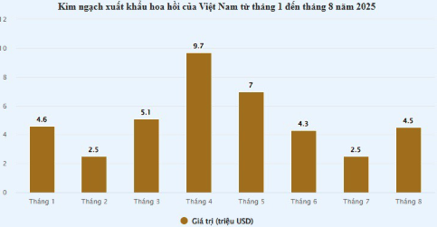 Lũy kế đến hết tháng 8/2025, các doanh nghiệp thu về khoảng 40,2 triệu USD (tương đương 1.042 tỷ đồng) nhờ xuất khẩu 10.248 tấn hoa hồi. Dù lượng hoa hồi xuất khẩu tăng 12,4%, nhưng kim ngạch lại giảm 8,1% so với cùng kỳ năm ngoái.