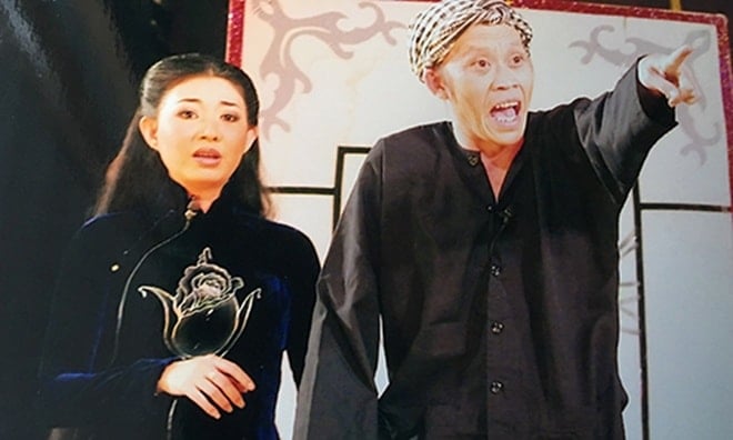 Ca sĩ Hà My và Nghệ sĩ Ưu tú Hoài Linh trên sân khấu. Ảnh: FBNV