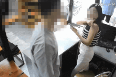 Chỉ có một mình ở cửa hàng, cô gái tỏ rõ sự hoang mang, hoảng sợ và không dám bước ra khỏi quầy thu ngân. Khi gã thanh niên có ý định sáp lại, nữ nhân viên lập tức có tư thế phòng bị, chỉ tay vào camera trên tường nhắc nhở. Người này sau đó nói "Em trêu chị, em đùa thôi" rồi bỏ đi.