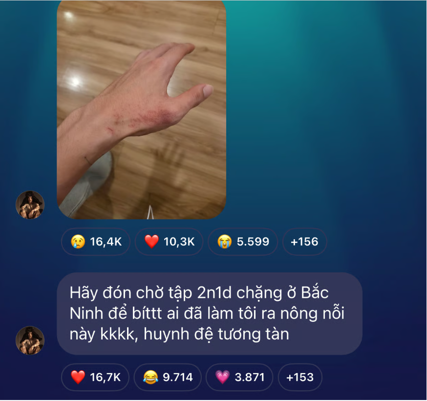 Ngay sau khi clip bị vây kín lan truyền, nhiều người hâm mộ không khỏi lo lắng cho HIEUTHUHAI. Nhiều thông tin cho rằng nam rapper bị thương trong quá trình quay hình tại đây. Tối qua, HIEUTHUHAI cũng đăng tải hình ảnh bàn tay bị thương trong group broadcast riêng, giải thích rằng đây là kết quả của màn "huynh đệ tương tàn" trong chặng Bắc Ninh của 2 Ngày 1 Đêm mùa 4.