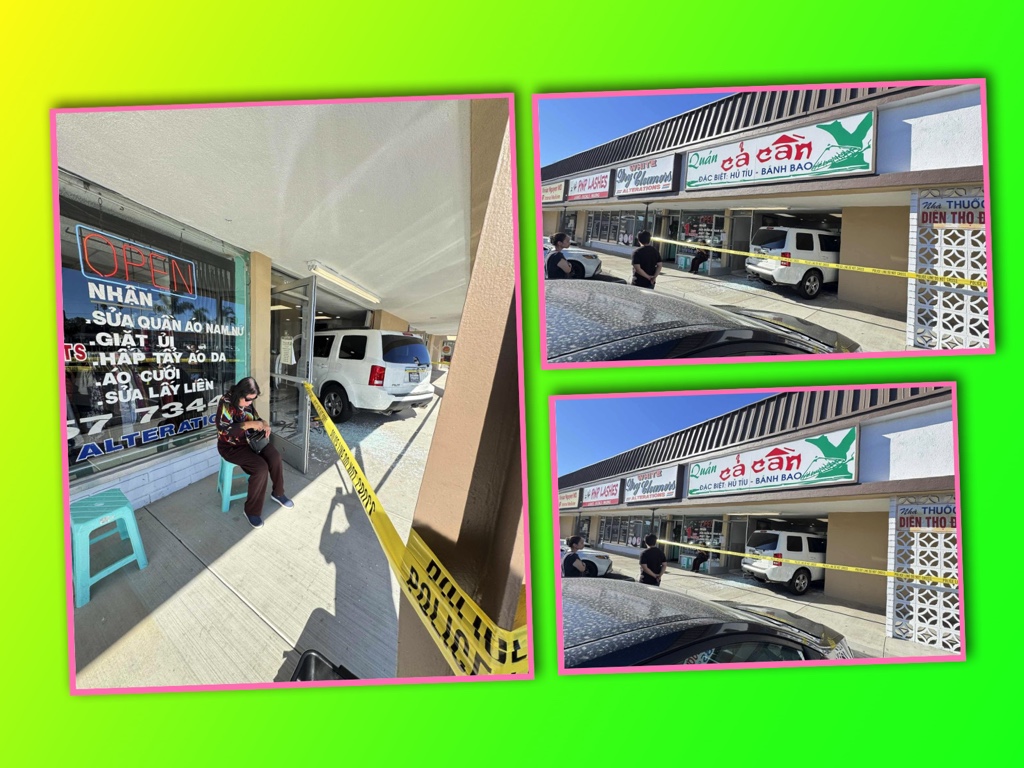 Một chiếc SUV màu trắng đã lao xuyên cửa kính vào bên trong tiệm Quán Cả Cần (đặc biệt: hủ tiếu – bánh bao) trong một dãy shophouse người Việt. Hiện trường cho thấy kính vỡ văng đầy lối đi, khu vực trước cửa tiệm bị giăng dây “POLICE LINE – DO NOT CROSS”.