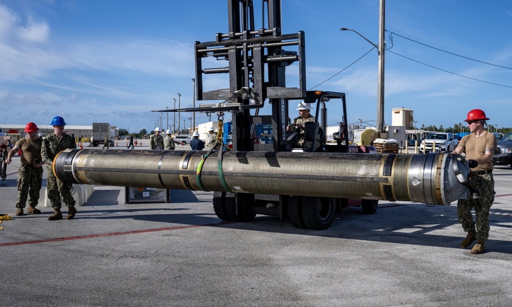 Kỹ thuật viên Mỹ chuẩn bị nạp tên lửa Tomahawk lên tàu ngầm ở quân cảng Guam hồi năm 2024. Ảnh: US Navy
