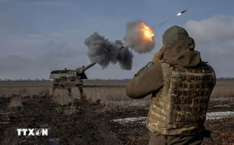 Binh sỹ Ukraine bắn lựu pháo bọc thép 2000 trong cuộc xung đột với Nga. (Ảnh: Reuters/TTXVN)