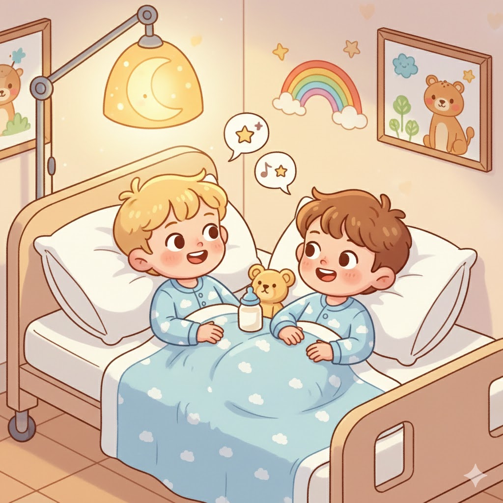 Hai chú nhóc nằm cạnh nhau trong phòng bệnh nhi, buồn quá nên rủ nhau tám chuyện: