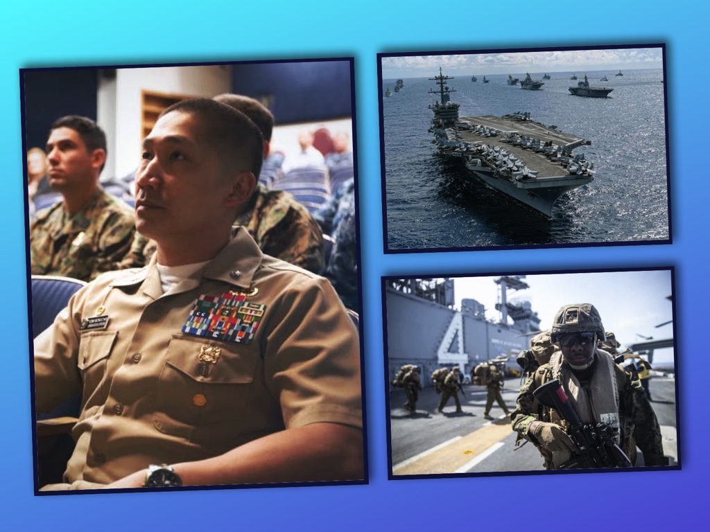 Mỹ: Cụm tàu sân bay hạt nhân (CVN) và tàu đổ bộ boong lớn (LHA/LHD); không đoàn hải quân với F-35C/F-18E/F, tác chiến điện tử EA-18G; thủy quân lục chiến với MLR (Marine Littoral Regiment) trang bị NMESIS (Naval Strike Missile), HIMARS, UAV; tàu ngầm tấn công hạt nhân lớp Virginia/Seawolf; tên lửa Tomahawk Blk V (đánh hạm), LRASM, SM-6; hệ thống cảm biến–liên kết CEC/NIFC-CA và JADC2; trinh sát P-8A, vệ tinh ISR và máy bay trinh sát chiến lược.