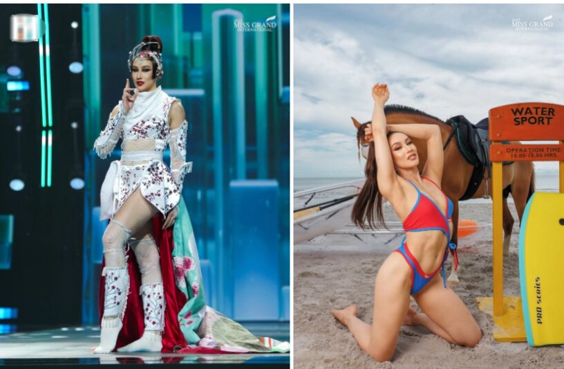 Tại bán kết Miss Grand International 2025, người đẹp Nhật Bản tiếp tục sử dụng kỹ năng nhào lộn và gặp sự cố trong lúc trình diễn áo tắm.