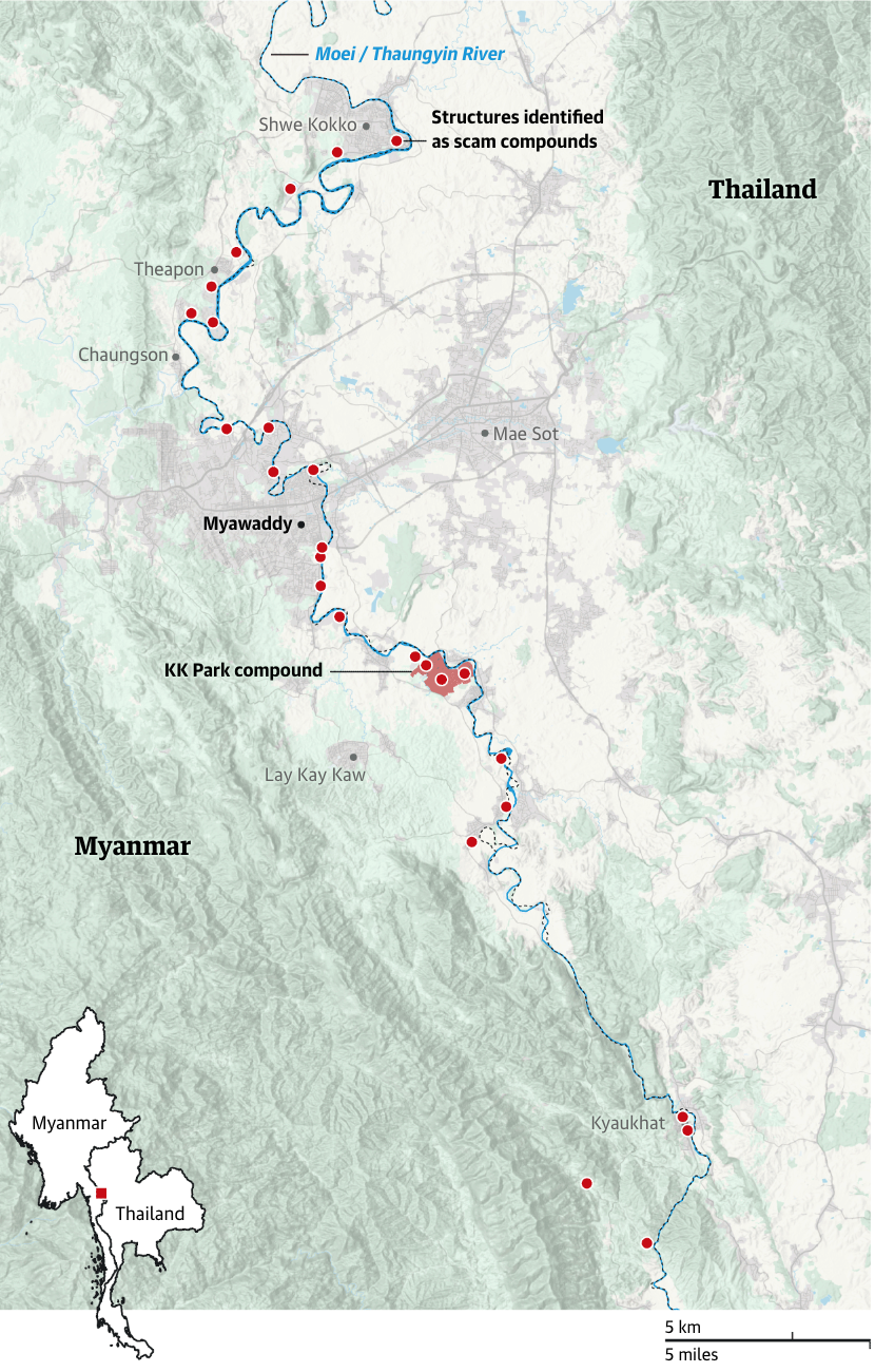 Bản đồ trung tâm lừa đảolớn nhất KK Park và các ổ lừa đảo khác tại biên giới Thái Lan - Myanmar. (Ảnh: Guardian)