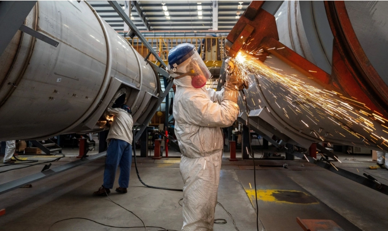 Công nhân làm việc trên dây chuyền sản xuất, chế tạo container bồn tại một nhà máy ở Nam Thông, tỉnh Giang Tô, Trung Quốc, hồi tháng 4. Ảnh: Reuters
