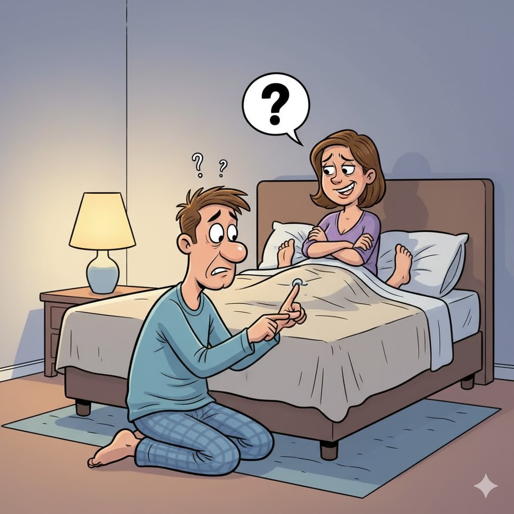 Một đêm khuya, người chồng say rượu về nhà. Anh leo lên giường nằm cạnh vợ, nhưng khi nhìn xuống cuối giường anh giật mình hét lên: