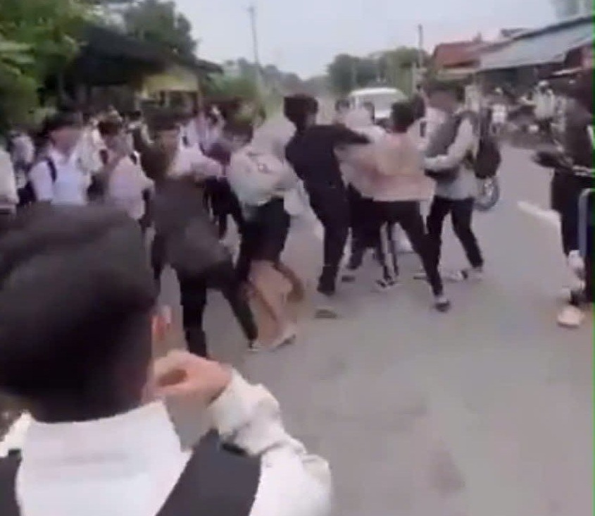 Nhóm học sinh trong trường THCS&THPT Mỹ Quý đánh nhau với một số học sinh đã nghỉ học bên ngoài cổng trường gây náo loạn cả khu vực. Ảnh: Thiên Long