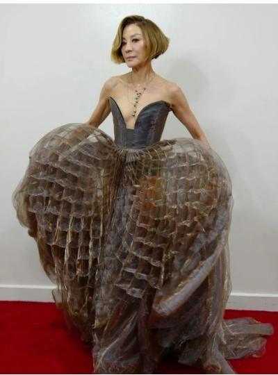 Tại sự kiện, Dương Tử Quỳnh trở thành tâm điểm chú ý khi diện chiếc váy với thiết kế bị nhận xét kỳ quặc. Trang phục cầu kỳ thuộc nhà mốt Iris van Herpen có phần thân trên ôm sát, phía dưới là chân váy bồng bềnh với tông màu nâu xám chủ đạo. Dương Tử Quỳnh để kiểu tóc bob trẻ trung, cá tính, phối thêm dây chuyền tạo điểm nhấn cho phần thân trên.
