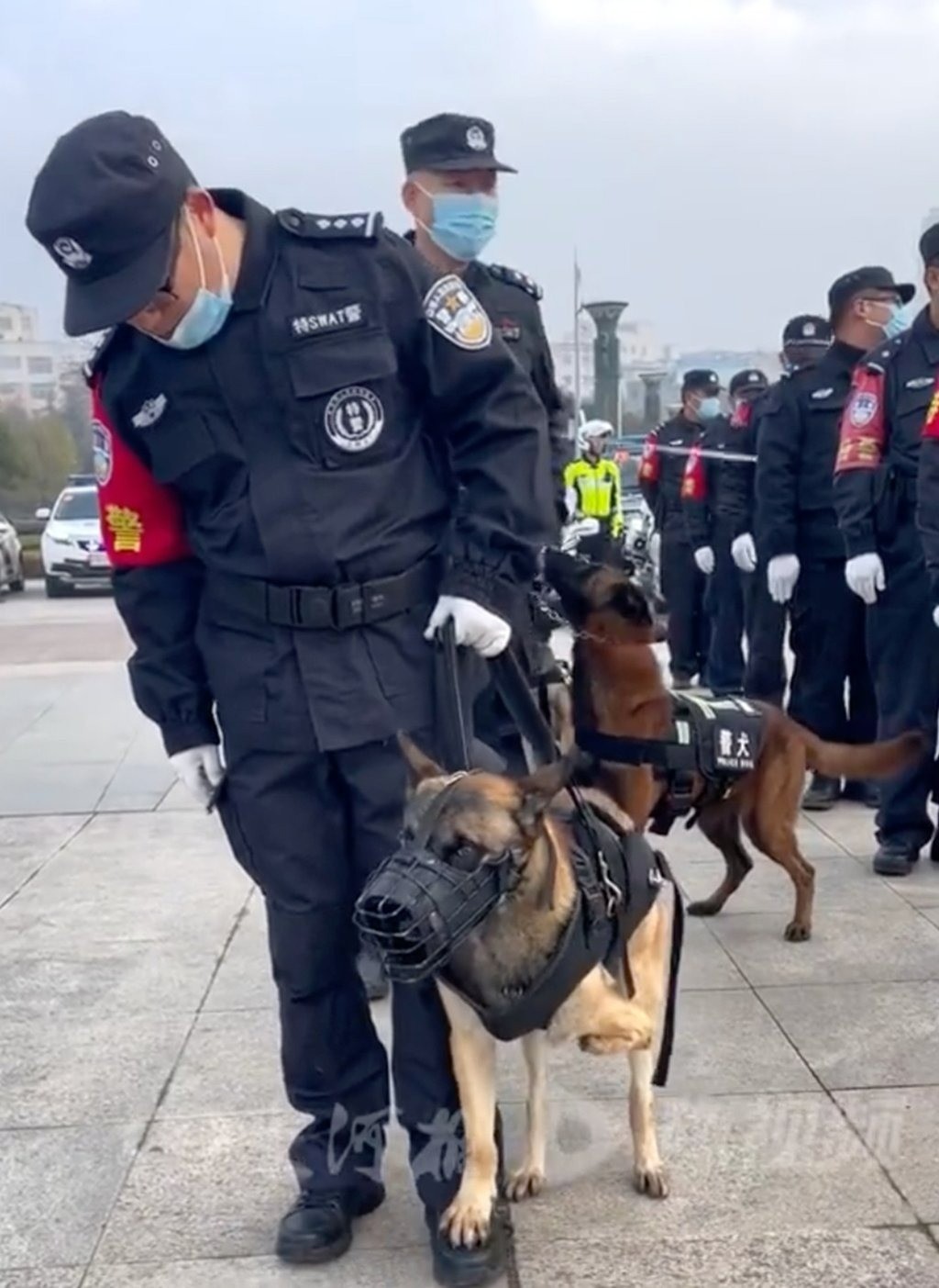 Đến tháng 7/2021, khi mới 2 tuổi, Barton vượt qua kỳ thi chứng nhận cảnh khuyển và chính thức trở thành thành viên của lực lượng chống bạo động. Ảnh: Weibo