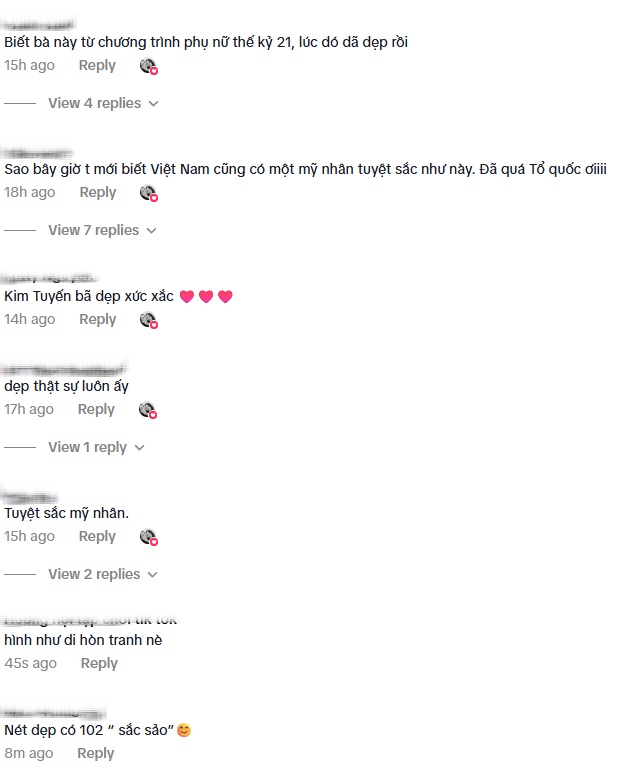 Thời gian gần đây, NSƯT Kim Tuyến liên tục trở thành tâm điểm chú ý khi nhận được sự yêu thích lớn từ cộng đồng mạng. Ở độ tuổi U40, nữ diễn viên vẫn giữ được vẻ ngoài trẻ trung, tươi tắn với đường nét gương mặt hài hòa và thần thái cuốn hút khó rời mắt. Không chỉ vậy, mỹ nhân sinh năm 1987 còn khiến dân tình bất ngờ khi khoe vóc dáng nóng bỏng, quyến rũ chẳng kém các mỹ nhân thế hệ trẻ. Đoạn video của nữ diễn viên bất ngờ viral trở lại, nhanh chóng hút hơn 1,2 triệu lượt xem chỉ sau chưa đầy 1 ngày đăng tải, kèm với vô số lời khen. Thậm chí, nhiều netizen còn ví Kim Tuyến là mỹ nhân đẹp nhất Việt Nam hiện tại, một “tuyệt sắc giai nhân” sánh ngang Tăng Thanh Hà với vẻ đẹp trường tồn theo thời gian.