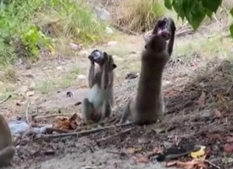 Đoạn clip ghi lại cho thấy hai con khỉ khát nước liên tục đổ bia từ lon vào miệng rồi uống cạn, trong khi Pichet và những người khác chỉ có thể đứng từ xa quan sát. Đáng chú ý, một con khỉ khác còn gục đầu vào cây cột, trông chẳng khác nào đang say bia.