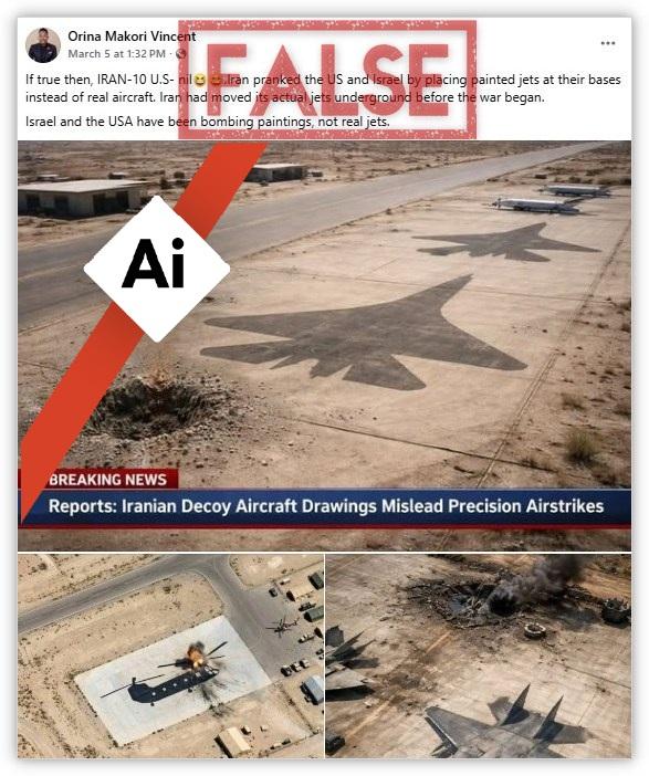 “Nếu đúng như vậy thì, Iran-10 Mỹ-0. Iran đã chơi khăm Mỹ và Israel bằng cách vẽ những chiếc máy bay phản lực thay vì máy bay thật tại các căn cứ của họ. Iran đã di chuyển các máy bay phản lực thực sự của mình xuống lòng đất trước khi cuộc chiến bắt đầu”, bài viết trên Facebook được đăng tải bởi một tài khoản ở Kenya vào ngày 5.3 cho biết.
