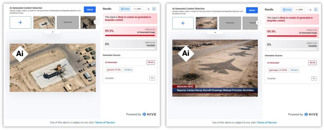 Một phân tích riêng biệt của Hive Moderation cũng kết luận rằng hai hình ảnh đầu tiên trong bài đăng (hiện đã bị xóa) được tạo ra bằng AI.