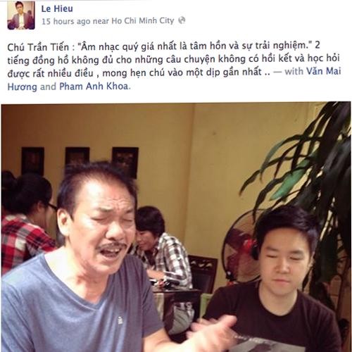 Mới gần đây, Lê Hiếu đã chia sẻ một bức ảnh chụp cùng "người du ca" với dòng trích dẫn: Chú Trần Tiến : "Âm nhạc quý giá nhất là tâm hồn và sự trải nghiệm." 2 tiếng đồng hồ không đủ cho những câu chuyện không có hồi kết và học hỏi được rất nhiều điều , mong hẹn chú vào một dịp gần nhất".
