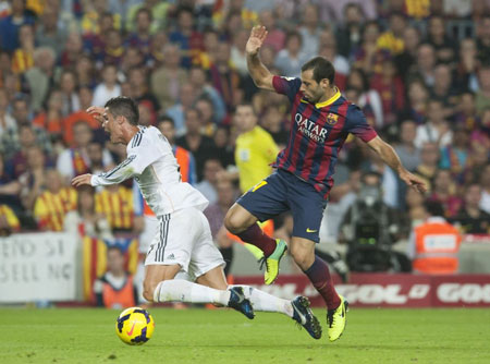 4. Tình huống gây tranh cãi nhất của trận đấu diễn ra ở phút thứ 71 của trận đấu. Từ đường chọc khe rất thoáng của Di Maria, Cristiano Ronaldo băng xuống rất nhanh và đứng trước cơ hội dứt điểm tung lưới Barcelona. Tuy nhiên Javier Mascherano, cầu thủ theo kèm C.Ronaldo nhưng bị yếu thế đã đẩy ngã siêu sao người Bồ Đao Nha.