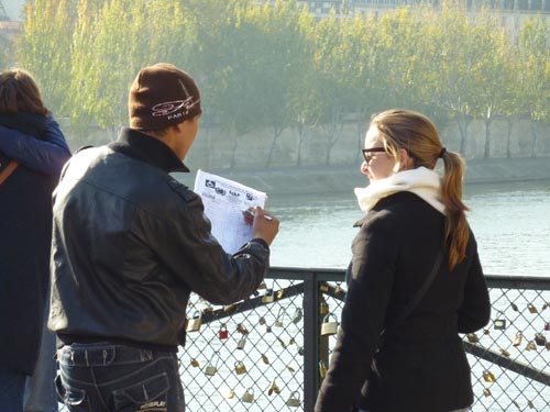 Trò lừa đảo này thường đánh vào những du khách ngây thơ và không biết tiếng Pháp, và thường diễn ra ở khu vực quanh cầu tình yêu Pont de l’Archeveche.