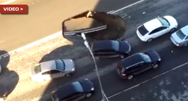 Video cho thấy, bắt đầu là những vết nứt lớn dần, rồi tạo thành một vòng tròn và lún xuống. May mắn là quá trình diễn ra đủ chậm để các lái xe chủ động lái tránh: