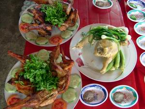 Khách uống một chai bia, nhấm nháp miếng bánh tráng nướng hay đậu phộng rang để khai vị và ngay sau đó, các món ăn lần lượt được bưng lên. Bếp lò than dành cho món nướng. Thịt gà chặt miếng ướp gia vị ớt xiêm, hành, tỏi được đặt trên chiếc bàn nhỏ bên cạnh để khách “tự biên, tự diễn”, nướng đến đâu, ăn đến đó. Miếng gà mềm, nóng hổi, bốc khói, ngọt đậm đà. Cách ăn gia đình này (tự nướng) vừa vui vẻ, vừa thòm thèm (do phải chờ đợi). Khách có thể vừa chuyện trò, vừa nướng gà tạo không khí thân mật và ấm cúng.