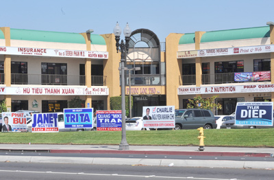 Bảng vận động của các ứng cử viên gốc Việt tại Asian Village trên đại lộ Bolsa, Westminster, trung tâm Little Saigon. (Hình: Dân Huỳnh/Người Việt)