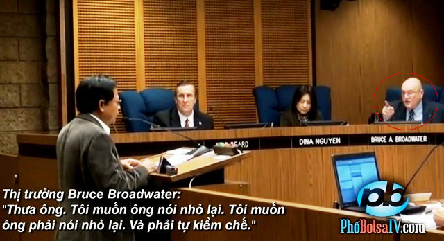 Dân CC kiếm cơm cờ vàng khè tranh giành miếng ăn nên mắng nhiếc ,đấu tố,choảng nhau như hàng tôm hàng cá là rất thường ở "thủ đô tị nạn".Tức tối vì bị hội đồng thành phố TP Garden Grove gạt ra rìa,không cho tổ chức hội chợ tết.Cờ vàng NTL,chủ tịch cộng đồng Việt-Mỹ làm le một mình tới dự phiên họp của thị trưởng thành phố ( các cờ vàng khác không dám tham gia) để hạch sách và "khiếu nại" với thị trưởng Broadwater và phó thị trưởng Dina Nguyễn cùng các nghị viên khác tại sao không cho "cộng đồng" tham gia hội chợ tết.Ông chủ tịch cộng đồng phát biểu rất hung hăng con bọ xít ,ai ngờ bị ông thị trưởng Mỹ ngắt lời và chỉ tay thẳng vào mặt "cảnh cáo".ông chủ tịt cộng đồng quê quá ấp a ấp úng bào chửa "tôi...tôi..chỉ ...chỉ muốn" và "sorry".Sau đó cụp đuôi luôn.hehe